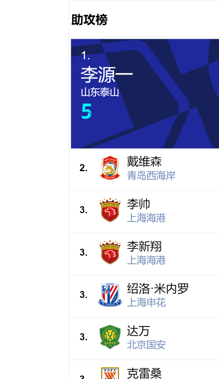 近日中超官方公布5轮下来的助攻榜,李源一5个助攻是榜首,作为后腰球员,本赛季他的潜力也是爆发出来,分别在各种比赛都有助攻。现在山东泰山距离积分榜就差1分,随时都有可能超越上海双雄。可以说他是山东泰山克雷桑之后, 表现最好的山东球员!